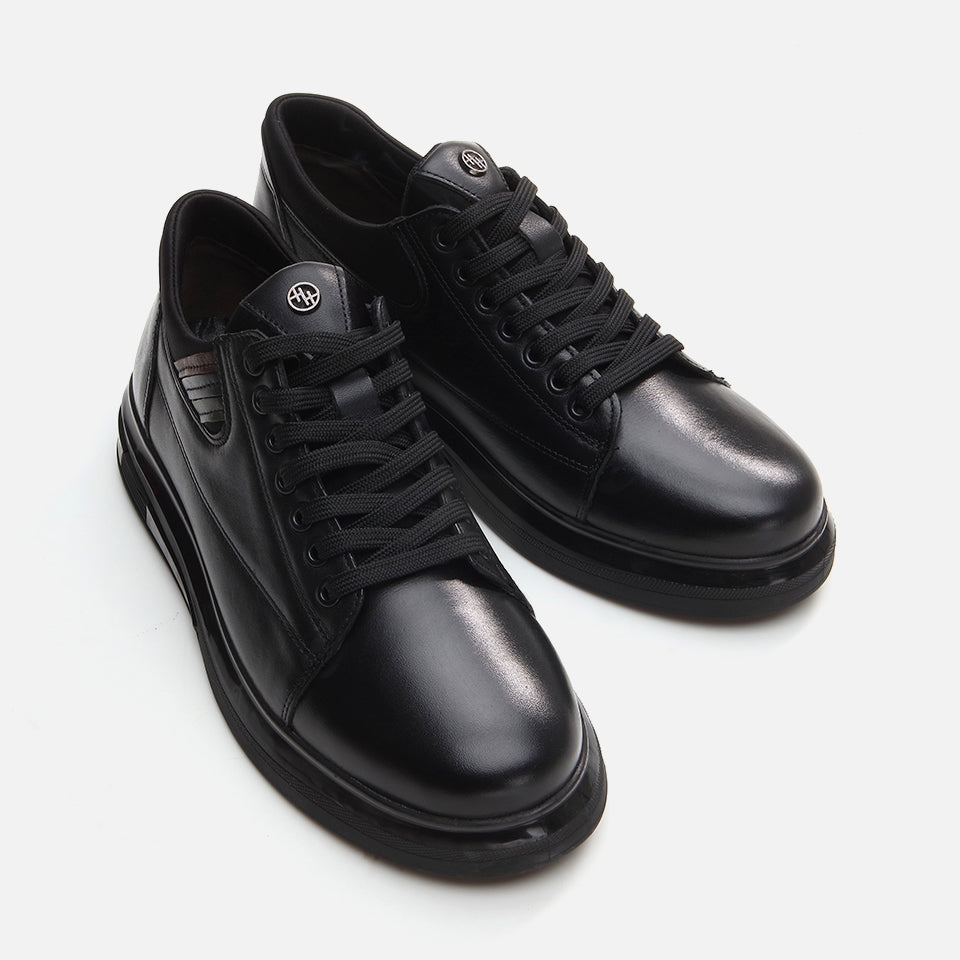 [Image Alt Text]: A pair of black genuine leather casual shoes for men.